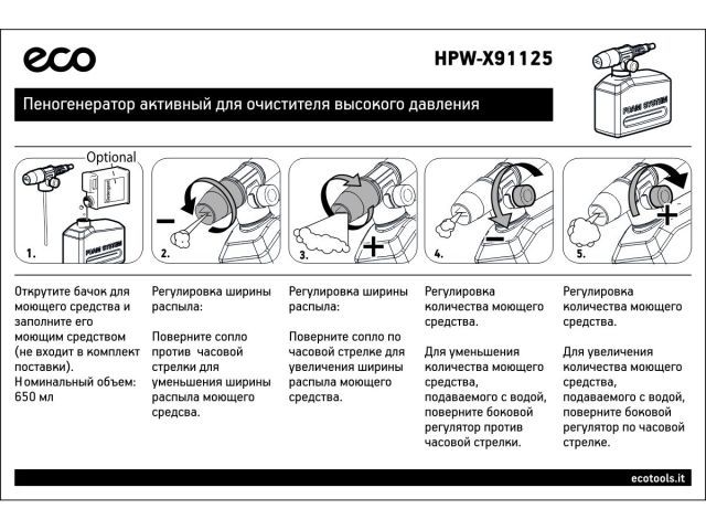 Пеногенератор активный предназначен для очистителей высокого давления ECO. Регулировка подачи количества пены. Регулировка формы струи. Номинальный объем 650 мл. Совместим с пистолетами HPW-X10073 и 18250004.
