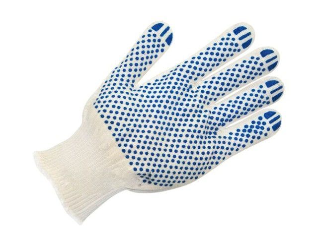 Перчатки кругловязанные, характеризуются стандартной плотностью вязки - 13 петель на дюйм - и совокупной толщиной смесовой нити 85 - 90 текс, 13 класс вязки. Основные качества: защитные рабочие перчатки изготовлены из хлопчатобумажного волокна высокого качества и имеют точечное ПВХ-покрытие на ладонной части. Благодаря этому, перчатки обладают высокой износостойкостью и прочностью, а также создают отличное сцепление со скользкими поверхностями. Мягкая текстура не сковывает движений рук, что способствует удобству эксплуатации перчаток. Сфера применения: использовать перчатки рекомендуется в сухих условиях при выполнении погрузочно-разгрузочных, фасовочных и легких монтажных работ. В автомеханике, текстильной и легкой промышленности, складском хозяйстве и МТО без этих перчаток просто не обойтись. Также их можно применять в работе с полимерами. Технологические свойства: перчатки хб с ПВХ точкой очень практичны они устойчивы к воздействию хлора и отлично стираются при температуре 60 С. Размер: длина - 24 см, манжет - 5 см. Состав: пряжа хб - 80%, нить пэ - 20%, пластизоль - 10 гр. Вес одной пары: 42-44 гр. Фасовка: 200 пар Плюсы ручного оверлока: Ручной оверлок не пушится и не распускается во время эксплуатации, тем самым предотвращая от различного вида травм и несчастных случаев на производстве, где присутствуют крутящиеся, прижимающиеся, цепные и другие механизмы, в которые может попасть распустившаяся нить. Срок службы перчаток с ручным оверлоком многократно превышает срок службы аналогичных изделий с автоматическим оверлоком , что достигается высокой прочностью обшивки края манжета. Ручной оверлок более плотно облегает запястье руки, тем самым обеспечивая более надёжную защиту от попадания внутрь инородных предметов при различных видах работ на протяжении всего срока службы изделия. Ручной оверлок - это полностью отдельная операция, которая обеспечивает дополнительный контроль качества предыдущих этапов производства.