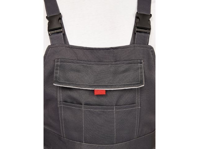 Полукомбинезон прямого силуэта с застёжкой в левом боковом шве на три петли и пуговицу, гульфик на молнии. Бретели на резинках регулируются фастексами. На нагруднике расположен двойной накладной карман с клапаном на контактной ленте, малый накладной карман разделён на три части. Боковые накладные карманы имеют наклонную линию входа. На задней половине расположен фигурный накладной карман. Есть двойной карман для инструментов.