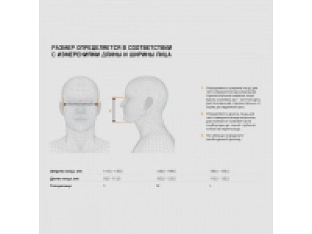 - - система регулировки (полумаска перемещается по стропам оголовья, что позволяет отнимать её от лица без снятия в т.ч. других средств защиты, например, каски);