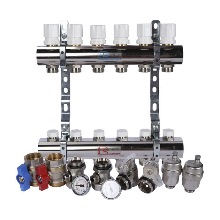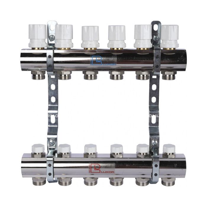 Распределительный коллектор (группа) для отопления Luxor 15552706MN ВР 1", на 6 контуров 3/4" EK, никелированный