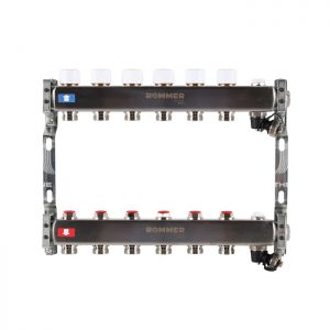 Коллекторные распределительные блоки Rommer предназначены для улучшения производительности систем отопления зданий, за счет равномерного распределения теплоносителя по контурам. Коллекторы могут использоваться как в домах индивидуальной застройки, так и в системах отопления многоквартирных жилых зданий, где требуется распределение потока теплоносителя между помещениями на этаже многоквартирного многоэтажного жилого или административного здания. Коллекторные блоки выполняют следующие функции: независимое друг от друга присоединение контуров системы отопления и распределение по ним теплоносителя; гидравлическая балансировка системы в пределах квартиры, обслуживаемой одним коллекторным блоком; регулирование температуры воздуха в отапливаемых помещениях; удаление воздуха из системы отопления и ее дренаж; отключение отдельных контуров и системы отопления в целом. Распределительный коллекторный блок Rommer состоит из подающей и обратной гребенок, каждая из которых имеет от 2 до 12 выходов. Подающая гребенка имеет возможность отключения (перекрытия) каждого отдельного контура системы отопления или теплого пола, для чего оснащается расходомерами, либо запорно-регулирующими клапанами. Обратная гребенка оборудуется терморегулирующими клапанами с предварительной настройкой пропускной способности. Терморегулирующие клапаны могут быть автоматизированы с помощью термоэлектрических сервоприводов. Для ограничения расхода теплоносителя на каждый отвод выполняется предварительная настройка пропускной способности. Коллектор с запорными клапанами укомплектован: 1 обратный коллектор с отсечными клапанами под электротермоприводы; 1 подающий коллектор с запорными вентилями; 2 цельнометаллических кронштейна; 2 клапана выпуска воздуха и 2 сливных крана.