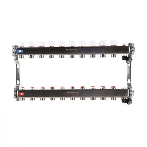 Коллекторные распределительные блоки Rommer предназначены для улучшения производительности систем отопления зданий, за счет равномерного распределения теплоносителя по контурам. Коллекторы могут использоваться как в домах индивидуальной застройки, так и в системах отопления многоквартирных жилых зданий, где требуется распределение потока теплоносителя между помещениями на этаже многоквартирного многоэтажного жилого или административного здания. Коллекторные блоки выполняют следующие функции: независимое друг от друга присоединение контуров системы отопления и распределение по ним теплоносителя; гидравлическая балансировка системы в пределах квартиры, обслуживаемой одним коллекторным блоком; регулирование температуры воздуха в отапливаемых помещениях; удаление воздуха из системы отопления и ее дренаж; отключение отдельных контуров и системы отопления в целом. Распределительный коллекторный блок Rommer состоит из подающей и обратной гребенок, каждая из которых имеет от 2 до 12 выходов. Подающая гребенка имеет возможность отключения (перекрытия) каждого отдельного контура системы отопления или теплого пола, для чего оснащается расходомерами, либо запорно-регулирующими клапанами. Обратная гребенка оборудуется терморегулирующими клапанами с предварительной настройкой пропускной способности. Терморегулирующие клапаны могут быть автоматизированы с помощью термоэлектрических сервоприводов. Для ограничения расхода теплоносителя на каждый отвод выполняется предварительная настройка пропускной способности. Коллектор с запорными клапанами укомплектован: 1 обратный коллектор с отсечными клапанами под электротермоприводы; 1 подающий коллектор с запорными вентилями; 2 цельнометаллических кронштейна; 2 клапана выпуска воздуха и 2 сливных крана.