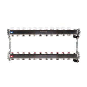 Коллекторные распределительные блоки Rommer предназначены для улучшения производительности систем отопления зданий, за счет равномерного распределения теплоносителя по контурам. Коллекторы могут использоваться как в домах индивидуальной застройки, так и в системах отопления многоквартирных жилых зданий, где требуется распределение потока теплоносителя между помещениями на этаже многоквартирного многоэтажного жилого или административного здания. Коллекторные блоки выполняют следующие функции: независимое друг от друга присоединение контуров системы отопления и распределение по ним теплоносителя; гидравлическая балансировка системы в пределах квартиры, обслуживаемой одним коллекторным блоком; регулирование температуры воздуха в отапливаемых помещениях; удаление воздуха из системы отопления и ее дренаж; отключение отдельных контуров и системы отопления в целом. Распределительный коллекторный блок Rommer состоит из подающей и обратной гребенок, каждая из которых имеет от 2 до 12 выходов. Подающая гребенка имеет возможность отключения (перекрытия) каждого отдельного контура системы отопления или теплого пола, для чего оснащается расходомерами, либо запорно-регулирующими клапанами. Обратная гребенка оборудуется терморегулирующими клапанами с предварительной настройкой пропускной способности. Терморегулирующие клапаны могут быть автоматизированы с помощью термоэлектрических сервоприводов. Для ограничения расхода теплоносителя на каждый отвод выполняется предварительная настройка пропускной способности. Коллектор с запорными клапанами укомплектован: 1 обратный коллектор с отсечными клапанами под электротермоприводы; 1 подающий коллектор с запорными вентилями; 2 цельнометаллических кронштейна; 2 клапана выпуска воздуха и 2 сливных крана.