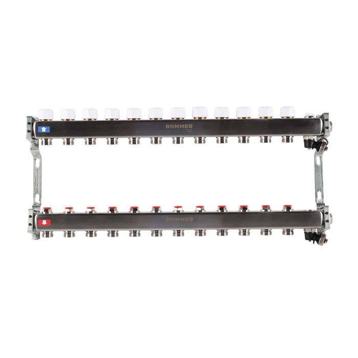 Распределительный коллектор (группа) для отопления Rommer RMS-3201-000012 ВР 1", на 12 контуров 3/4" EK, нержавеющая сталь