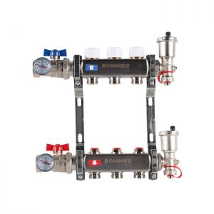 Коллекторные распределительные блоки Rommer предназначены для улучшения производительности систем отопления зданий, за счет равномерного распределения теплоносителя по контурам. Коллекторы могут использоваться как в домах индивидуальной застройки, так и в системах отопления многоквартирных жилых зданий, где требуется распределение потока теплоносителя между помещениями на этаже многоквартирного многоэтажного жилого или административного здания. Коллекторные блоки выполняют следующие функции: независимое друг от друга присоединение контуров системы отопления и распределение по ним теплоносителя; гидравлическая балансировка системы в пределах квартиры, обслуживаемой одним коллекторным блоком; регулирование температуры воздуха в отапливаемых помещениях; удаление воздуха из системы отопления и ее дренаж; отключение отдельных контуров и системы отопления в целом. Распределительный коллекторный блок Rommer состоит из подающей и обратной гребенок, каждая из которых имеет от 2 до 12 выходов. Подающая гребенка имеет возможность отключения (перекрытия) каждого отдельного контура системы отопления или теплого пола, для чего оснащается расходомерами, либо запорно-регулирующими клапанами. Обратная гребенка оборудуется терморегулирующими клапанами с предварительной настройкой пропускной способности. Терморегулирующие клапаны могут быть автоматизированы с помощью термоэлектрических сервоприводов. Для ограничения расхода теплоносителя на каждый отвод выполняется предварительная настройка пропускной способности. Коллектор с запорными клапанами укомплектован: 1 обратный коллектор с отсечными клапанами под электротермоприводы; 1 подающий коллектор с запорными клапанами; 2 цельнометаллических кронштейна; 2 перекрывающих шаровых крана с термометром; 2 концевых фитинга с воздухоотводчиком и сливным краном.