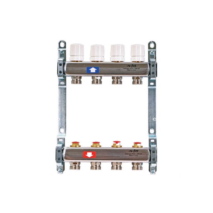 Коллекторные группы 1" Uni-Fitt модель 451B из нержавеющей стали 3/4" с регулировочными и термостатическими вентилями без концевиков предназначены для распределения и регулирования потоков теплоносителя в низко- или высокотемпературных системах отопления. Оснащены регулировочными вентилями на подающем коллекторе и термостатическими вентилями (с возможностью установки термоэлектрических приводов) на обратном коллекторе. На каждом отводе подающего коллектора установлены регулирующие вентили или расходомеры, комбинированные с балансировочными вентилями. Такая конструкция позволяет отрегулировать (сбалансировать) контуры системы отопления. Расходомеры показывают расход от 0 до 6 л/мин. При необходимости (например – для очистки) колбу расходомера можно снять и установить обратно без слива системы. Данная модель коллекторных групп не имеет расходомеров. Каждый отвод обратного коллектора снабжен термостатическим вентилем с установленной на нем головкой для ручной регулировки с возможностью установки электрического привода. Отводы подающего и обратного трубопроводов – это евроконусы с резьбой 3/4".
