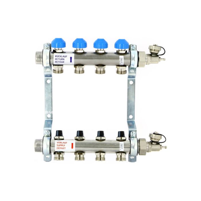 Коллекторные группы из нержавеющей стали с регулировочными и термостатическими вентилями Uni-Fitt H 1" х 3/4" модель 456W предназначены для распределения и регулирования потоков теплоносителя в низко- или высокотемпературных системах отопления. Оснащены регулировочными вентилями на подающем коллекторе и термостатическими вентилями (с возможностью установки термоэлектрических приводов) на обратном коллекторе. Каждое изделие укомплектовано дренажным клапаном / воздухоотводчиком, который может быть использован для заполнения системы. Коллекторные группы Uni-Fitt предлагаются двух видов: с расходомерами на подающем коллекторе на каждом отводе (в этом случае балансировка контуров производится регулировочными вентилями на обратном коллекторе), или без расходомеров (вентили регулировки расхода – на подающем коллекторе). Расходомеры показывают расход от 0 до 4 л/мин. Данная модель коллекторной группы не имеет расходомеров. Каждый отвод обратного коллектора снабжен термостатическим вентилем с установленной на нем головкой для ручной регулировки с возможностью установки электрического привода. Все виды коллекторных групп снабжены регулировочными (балансировочными) вентилями, позволяющими отрегулировать (сбалансировать) контуры системы отопления. Отводы подающего и обратного трубопроводов – это евроконусы с резьбой 3/4". Входящие в комплект концевые вентили могут быть установлены с любой стороны коллектора и служат для опорожнения системы и выпуска воздуха.