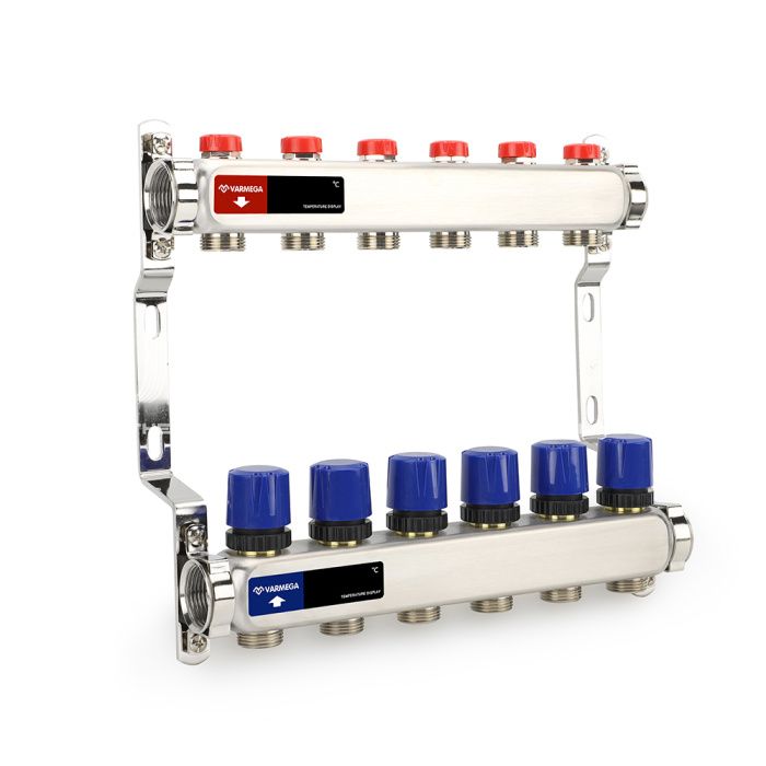 Распределительный коллектор (группа) для отопления Varmega VM15506 ВР 1", на 6 контуров 3/4" EK, нержавеющая сталь