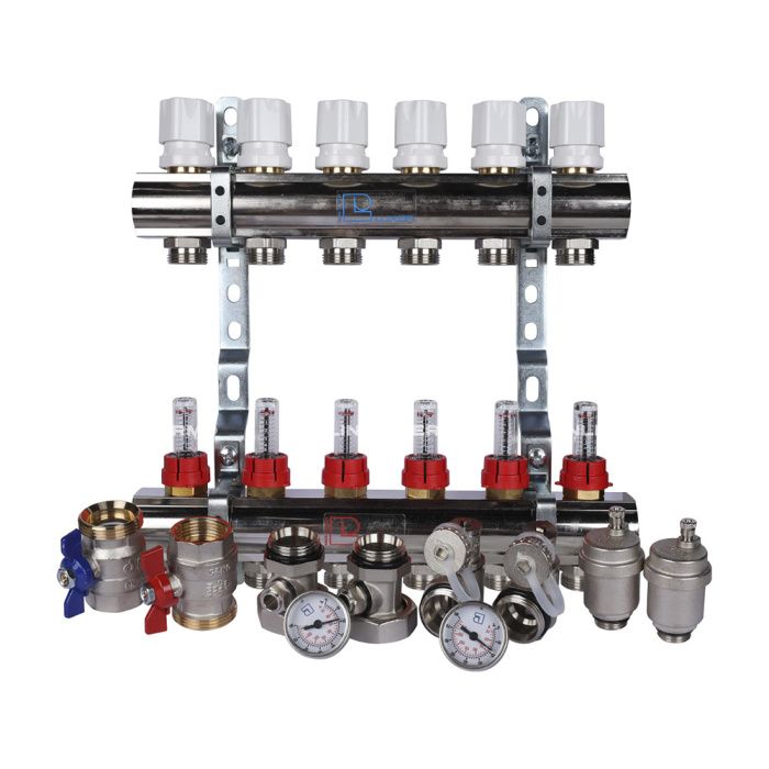 Коллекторы Luxor серии CD 473M - это коллекторные группы с расходомерами и регулировочными вентилями для систем теплого пола. Коллекторная группа в сборе Luxor CD 473M состоит из: 1 подающего коллектора с регуляторами-расходомерами; 1 обратного коллектора со встроенными вентилями с маховичком для ручной регулировки. Вентили предусматривают возможность термоэлектрической регулировки при помощи термоэлектрической головки; 2 запорных шаровых кранов с термометрами; 2 концевых узлов в комплекте с контргайкой, латунным кранов слива воды и встроенным клапаном спуска воздуха; 2 металлических кронштейнов. Выходы коллекторов выполнены по нормативам ISO 228. Соединение с боковыми отводами осуществляется с помощью фитингов с резьбой М24х19 и G 3/4 Евроконус. Все фитинги и принадлежности к коллекторам (вентили выпускные колпачки и т.д.) снабжены мягкими прокладками o-ring, нет необходимости в дополнительных прокладках типа пакли и т.д. Коллекторы со встроенными вентилями предполагают электротермическую регулировку и могут контролироваться и заменяться также в работающей системе.