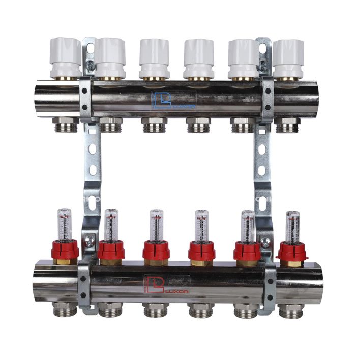 Распределительный коллектор (группа) с расходомерами Luxor 15652706MN ВР 1", на 6 контуров 3/4" EK, никелированный