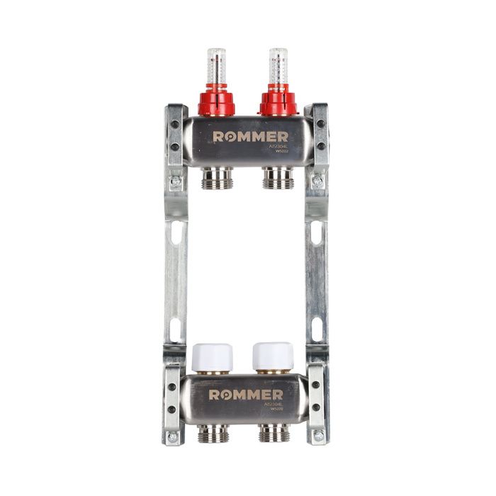 Распределительный коллектор (группа) с расходомерами Rommer RMS-1200-000002 ВР 1", на 2 контура 3/4" EK, нержавеющая сталь