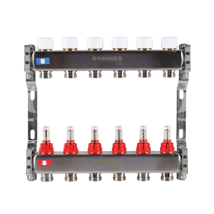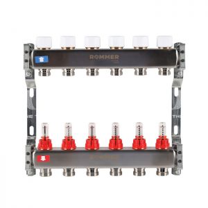 Коллекторные распределительные блоки Rommer предназначены для улучшения производительности систем отопления зданий, за счет равномерного распределения теплоносителя по контурам. Коллекторы могут использоваться как в домах индивидуальной застройки, так и в системах отопления многоквартирных жилых зданий, где требуется распределение потока теплоносителя между помещениями на этаже многоквартирного многоэтажного жилого или административного здания. Коллекторные блоки выполняют следующие функции: независимое друг от друга присоединение контуров системы отопления и распределение по ним теплоносителя; гидравлическая балансировка системы в пределах квартиры, обслуживаемой одним коллекторным блоком; регулирование температуры воздуха в отапливаемых помещениях; удаление воздуха из системы отопления и ее дренаж; отключение отдельных контуров и системы отопления в целом. Распределительный коллекторный блок Rommer состоит из подающей и обратной гребенок, каждая из которых имеет от 2 до 12 выходов. Подающая гребенка имеет возможность отключения (перекрытия) каждого отдельного контура системы отопления или теплого пола, для чего оснащается расходомерами, либо запорно-регулирующими клапанами. Обратная гребенка оборудуется терморегулирующими клапанами с предварительной настройкой пропускной способности. Терморегулирующие клапаны могут быть автоматизированы с помощью термоэлектрических сервоприводов. Для ограничения расхода теплоносителя на каждый отвод выполняется предварительная настройка пропускной способности. Коллектор с расходомерами укомплектован: 1 обратный коллектор с отсечными клапанами под электротермоприводы; 1 подающий коллектор с расходомерами; 2 цельнометаллических кронштейна.