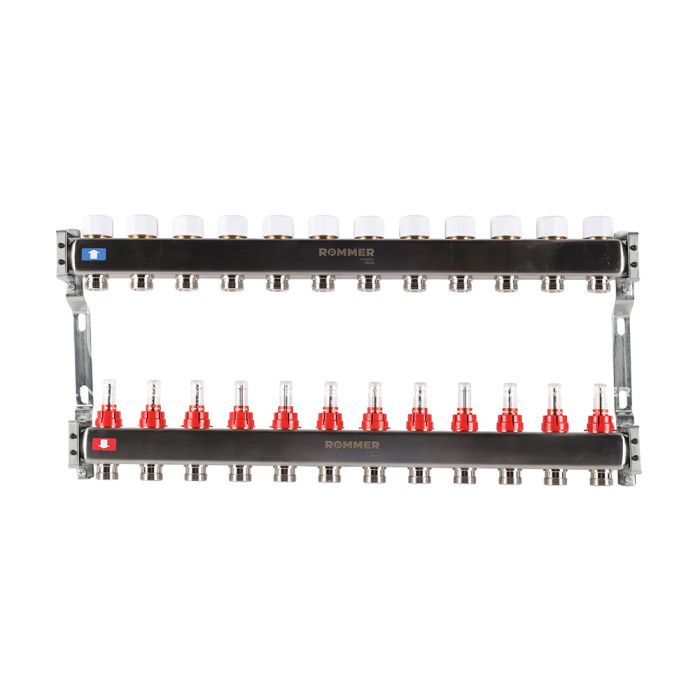 Коллекторные распределительные блоки Rommer предназначены для улучшения производительности систем отопления зданий, за счет равномерного распределения теплоносителя по контурам. Коллекторы могут использоваться как в домах индивидуальной застройки, так и в системах отопления многоквартирных жилых зданий, где требуется распределение потока теплоносителя между помещениями на этаже многоквартирного многоэтажного жилого или административного здания. Коллекторные блоки выполняют следующие функции: независимое друг от друга присоединение контуров системы отопления и распределение по ним теплоносителя; гидравлическая балансировка системы в пределах квартиры, обслуживаемой одним коллекторным блоком; регулирование температуры воздуха в отапливаемых помещениях; удаление воздуха из системы отопления и ее дренаж; отключение отдельных контуров и системы отопления в целом. Распределительный коллекторный блок Rommer состоит из подающей и обратной гребенок, каждая из которых имеет от 2 до 12 выходов. Подающая гребенка имеет возможность отключения (перекрытия) каждого отдельного контура системы отопления или теплого пола, для чего оснащается расходомерами, либо запорно-регулирующими клапанами. Обратная гребенка оборудуется терморегулирующими клапанами с предварительной настройкой пропускной способности. Терморегулирующие клапаны могут быть автоматизированы с помощью термоэлектрических сервоприводов. Для ограничения расхода теплоносителя на каждый отвод выполняется предварительная настройка пропускной способности. Коллектор с расходомерами укомплектован: 1 обратный коллектор с отсечными клапанами под электротермоприводы; 1 подающий коллектор с расходомерами; 2 цельнометаллических кронштейна.
