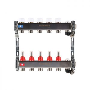 Коллекторные распределительные блоки Rommer предназначены для улучшения производительности систем отопления зданий, за счет равномерного распределения теплоносителя по контурам. Коллекторы могут использоваться как в домах индивидуальной застройки, так и в системах отопления многоквартирных жилых зданий, где требуется распределение потока теплоносителя между помещениями на этаже многоквартирного многоэтажного жилого или административного здания. Коллекторные блоки выполняют следующие функции: независимое друг от друга присоединение контуров системы отопления и распределение по ним теплоносителя; гидравлическая балансировка системы в пределах квартиры, обслуживаемой одним коллекторным блоком; регулирование температуры воздуха в отапливаемых помещениях; удаление воздуха из системы отопления и ее дренаж; отключение отдельных контуров и системы отопления в целом. Распределительный коллекторный блок Rommer состоит из подающей и обратной гребенок, каждая из которых имеет от 2 до 12 выходов. Подающая гребенка имеет возможность отключения (перекрытия) каждого отдельного контура системы отопления или теплого пола, для чего оснащается расходомерами, либо запорно-регулирующими клапанами. Обратная гребенка оборудуется терморегулирующими клапанами с предварительной настройкой пропускной способности. Терморегулирующие клапаны могут быть автоматизированы с помощью термоэлектрических сервоприводов. Для ограничения расхода теплоносителя на каждый отвод выполняется предварительная настройка пропускной способности. Коллектор с расходомерами укомплектован: 1 обратный коллектор с отсечными клапанами под электротермоприводы; 1 подающий коллектор с расходомерами; 2 цельнометаллических кронштейна; 2 клапана выпуска воздуха и 2 сливных крана.