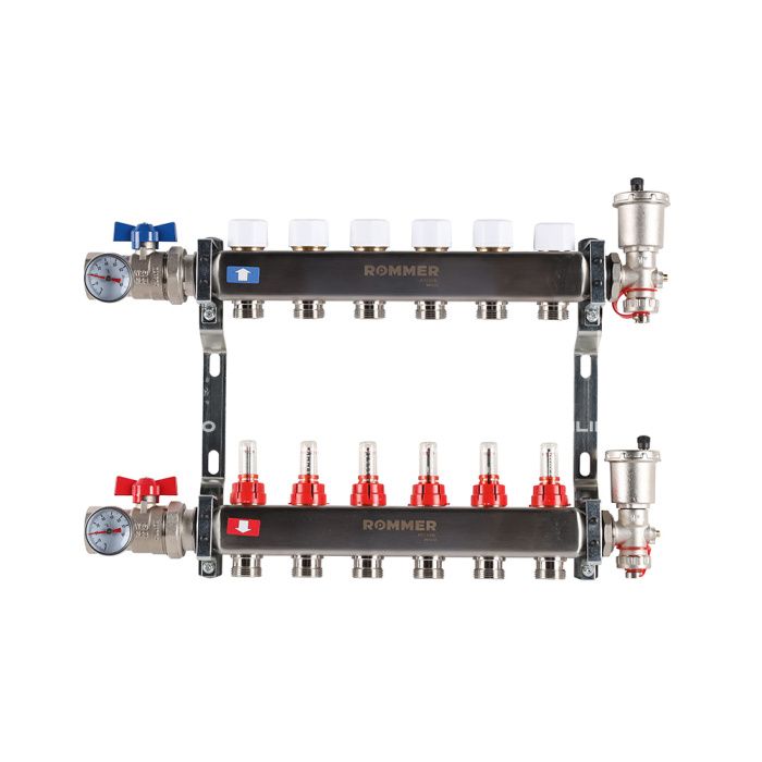 Коллекторные распределительные блоки Rommer предназначены для улучшения производительности систем отопления зданий, за счет равномерного распределения теплоносителя по контурам. Коллекторы могут использоваться как в домах индивидуальной застройки, так и в системах отопления многоквартирных жилых зданий, где требуется распределение потока теплоносителя между помещениями на этаже многоквартирного многоэтажного жилого или административного здания. Коллекторные блоки выполняют следующие функции: независимое друг от друга присоединение контуров системы отопления и распределение по ним теплоносителя; гидравлическая балансировка системы в пределах квартиры, обслуживаемой одним коллекторным блоком; регулирование температуры воздуха в отапливаемых помещениях; удаление воздуха из системы отопления и ее дренаж; отключение отдельных контуров и системы отопления в целом. Распределительный коллекторный блок Rommer состоит из подающей и обратной гребенок, каждая из которых имеет от 2 до 12 выходов. Подающая гребенка имеет возможность отключения (перекрытия) каждого отдельного контура системы отопления или теплого пола, для чего оснащается расходомерами, либо запорно-регулирующими клапанами. Обратная гребенка оборудуется терморегулирующими клапанами с предварительной настройкой пропускной способности. Терморегулирующие клапаны могут быть автоматизированы с помощью термоэлектрических сервоприводов. Для ограничения расхода теплоносителя на каждый отвод выполняется предварительная настройка пропускной способности. Коллектор с расходомерами укомплектован: 1 обратный коллектор с отсечными клапанами под электротермоприводы; 1 подающий коллектор с расходомерами; 2 цельнометаллических кронштейна; 2 перекрывающих шаровых крана с термометром; 2 концевых фитинга с воздухоотводчиком и сливным краном.
