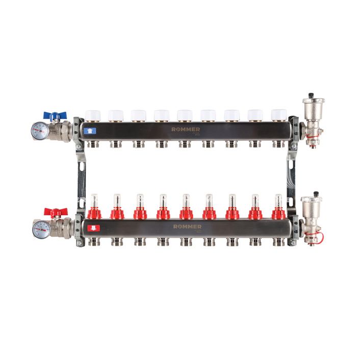 Коллекторные распределительные блоки Rommer предназначены для улучшения производительности систем отопления зданий, за счет равномерного распределения теплоносителя по контурам. Коллекторы могут использоваться как в домах индивидуальной застройки, так и в системах отопления многоквартирных жилых зданий, где требуется распределение потока теплоносителя между помещениями на этаже многоквартирного многоэтажного жилого или административного здания. Коллекторные блоки выполняют следующие функции: независимое друг от друга присоединение контуров системы отопления и распределение по ним теплоносителя; гидравлическая балансировка системы в пределах квартиры, обслуживаемой одним коллекторным блоком; регулирование температуры воздуха в отапливаемых помещениях; удаление воздуха из системы отопления и ее дренаж; отключение отдельных контуров и системы отопления в целом. Распределительный коллекторный блок Rommer состоит из подающей и обратной гребенок, каждая из которых имеет от 2 до 12 выходов. Подающая гребенка имеет возможность отключения (перекрытия) каждого отдельного контура системы отопления или теплого пола, для чего оснащается расходомерами, либо запорно-регулирующими клапанами. Обратная гребенка оборудуется терморегулирующими клапанами с предварительной настройкой пропускной способности. Терморегулирующие клапаны могут быть автоматизированы с помощью термоэлектрических сервоприводов. Для ограничения расхода теплоносителя на каждый отвод выполняется предварительная настройка пропускной способности. Коллектор с расходомерами укомплектован: 1 обратный коллектор с отсечными клапанами под электротермоприводы; 1 подающий коллектор с расходомерами; 2 цельнометаллических кронштейна; 2 перекрывающих шаровых крана с термометром; 2 концевых фитинга с воздухоотводчиком и сливным краном.