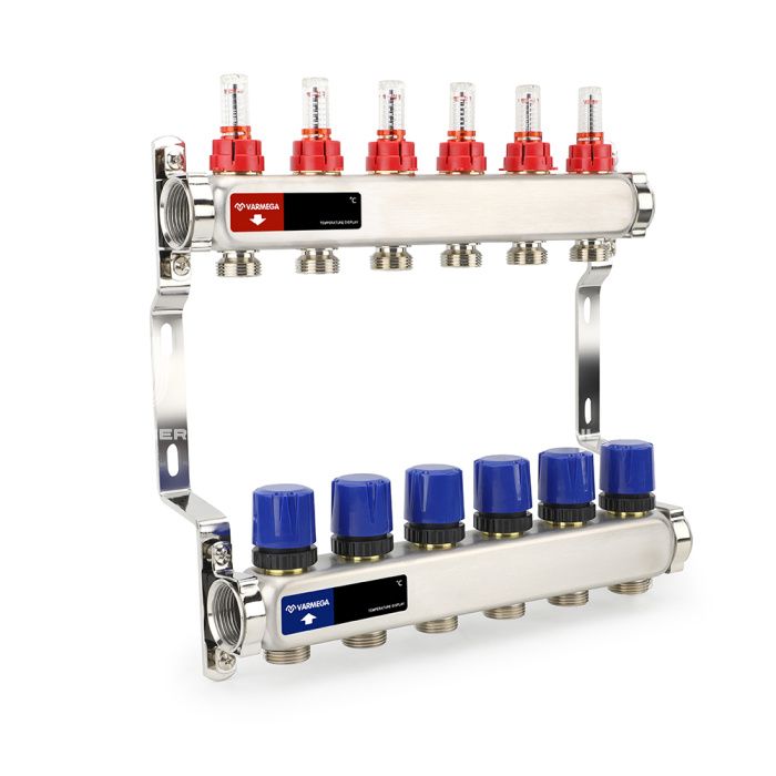 Распределительный коллектор (группа) с расходомерами Varmega VM15106 ВР 1", на 6 контуров 3/4" EK, нержавеющая сталь