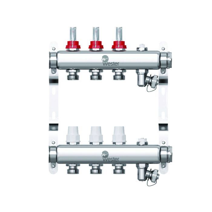 Распределительный коллектор (группа) с расходомерами Wester W902.3, 0-32-1815, 1", на 3 контура 3/4" EK, нержавеющая сталь