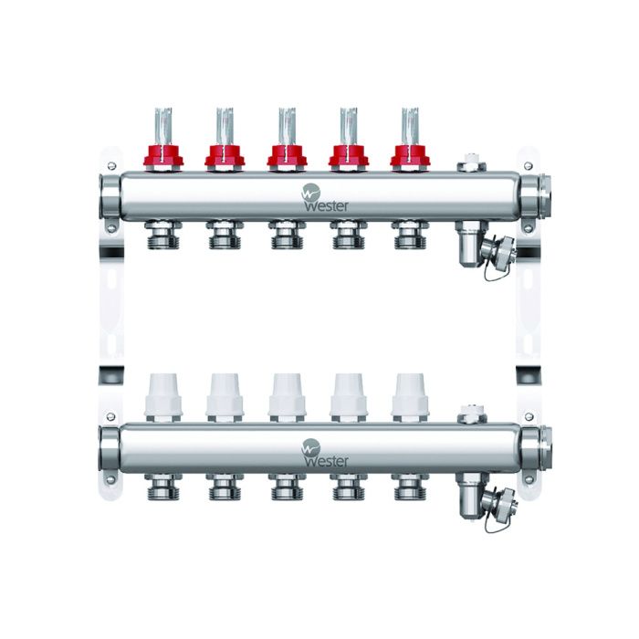 Распределительный коллектор (группа) с расходомерами Wester W902.5, 0-32-1825, 1", на 5 контуров 3/4" EK, нержавеющая сталь