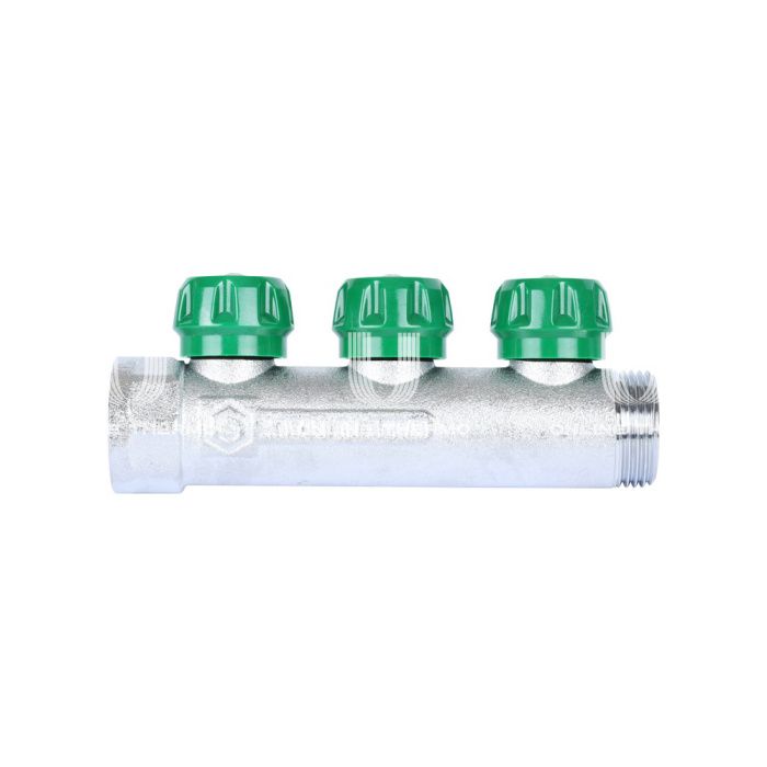 Регулирующий проходной коллектор Stout SMB-6850-013403, ВР-НР 1", на 3 контура 3/4" EK, модульный, евроконус, хромированный