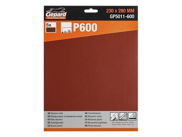 Шлифлист 230х280мм Р600 бум.осн. 5шт. GEPARD (GP5011-600)(бумага наждачная абразивная, лист шлифовальный абразивный, шлифшкурка)