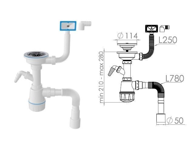 Сифон для мойки из нержавеющей стали, бутылочного типа, с большой колбой, с разборным выпуском 115 мм, с вертикальным и горизонтальным переливом Выпуск из нерж. стали 304 Штуцер: латунный Длина штуцера: 25 мм Выход в канализацию гибкая труба 1 12- 4050 мм