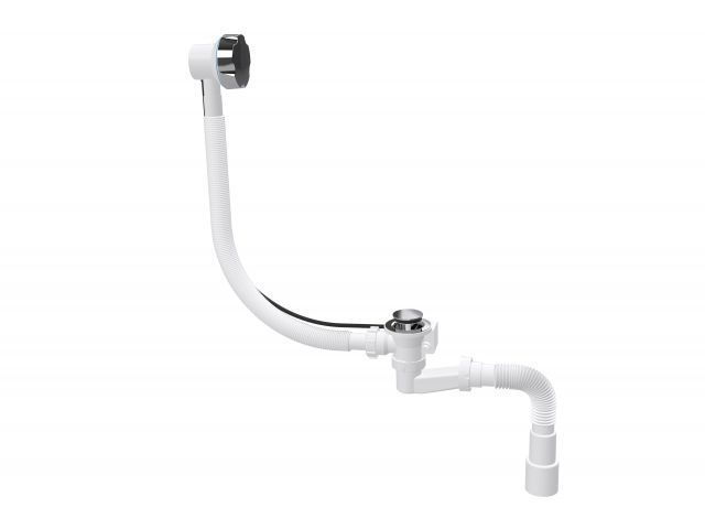 Сифон-автомат для ванны, h110 мм, выпуск 70 мм, с переливом; Рукоятка автоматики пластмассовая, хромированная Длина штуцера 50 мм Выход в канализацию гибкая труба 1 12- 4050 мм