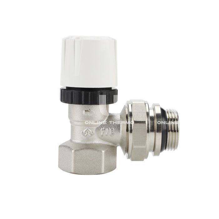 Термостатический клапан (терморегулятор) Varmega VM10413, 3/4" ВР-НР, угловой, с самоуплотняющимся полусгоном, без преднастройки