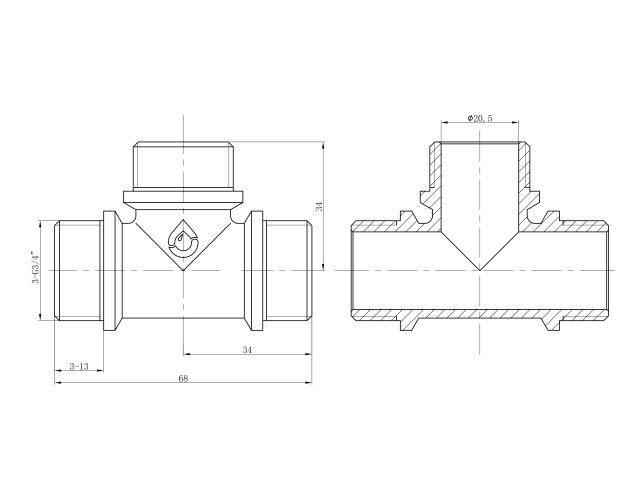 Тройник 3/4' нар.-нар.-нар. с ограничителем, AV Engineering (инд. упак.)(Латунь, макс. 16 бар, макс. 110 °С)