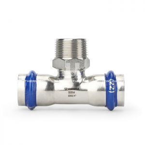 Тройник с наружной резьбой Varmega Inox Press с двух сторон имеет раструбное соединение для труб, а с другой стороны фитинга находится наружное резьбовое соединение. Данный фитинг позволяет присоединить к трубопроводу различные резьбовые элементы (краны, фильтры и т. п.), также дает возможность подключиться к другому типу трубопровода. Для получения надежного неразъемного соединения трубы и фитинга потребуется специальный пресс-инструмент с насадками типа профиль «V». Трубы и пресс-фитинги из нержавеющей стали серии Varmega Inox Press предназначены для транспортирования жидкостей, применяемых в системах питьевого водоснабжения, низкотемпературных и высокотемпературных системах отопления и системах охлаждения. Трубы и фитинги могут применяться в качестве технологических трубопроводов для транспортирования жидкостей и газов, не агрессивных к материалу труб и уплотнителей фитингов. Особенности применения: - Запрещается использовать фитинги системы с уплотнительными кольцами из EPDM на трубопроводах, транспортирующих жидкие углеводороды. В таких случаях необходимо заменить кольца из EPDM на кольца из FPM (Viton). Кольца FPM приобретаются отдельно. - Запрещается использовать трубы и фитинги системы Varmega Inox Press в атмосфере, насыщенной парами хлора (бассейны с хлорированием воды и т. п.). Содержание хлоридов в рабочей среде не должно превышать значений, указанных в техническом паспорте. - Непосредственное соединение элементов из нержавеющей стали с оцинкованной сталью (арматура, соединители) может вызвать коррозию оцинкованной стали, для предотвращения коррозии необходимо применять разделяющий элемент из латуни или бронзы с длиной не менее 50 мм. - Трубопроводная система Varmega Inox Press включает в себя трубы из нержавеющей стали, которые соединяются между собой и присоединяются к арматуре/приборам с помощью пресс-фитингов из нержавеющей стали. - Монтаж фитингов производится пресс-инструментом с насадками типа профиль «V». - Фитинги стандартно комплектуются уплотнителями O-Ring из этилен-пропилен-диенового каучука EPDM. - Отдельно можно приобрести набор уплотнительных колец из FPM (Viton). Замена на кольца из Viton повышает температурную и химическую стойкость системы. Пресс-фитинги Varmega Inox Press имеют два уникальных уровня индикации: - Все раструбные пресс-фитинги оснащены синей термоусаживаемой пленкой, которая остается на неопрессованном фитинге и слетает, если фитинг уже опрессован. - Все уплотнения EPDM, установленные в пресс-фитинги Varmega Inoxpress, имеют специальную конструкцию, которая будет показывать неопрессованные соединения, они будут не герметичны (протекать) под давлением от 0,1 до 6,0 бар. Благодаря такой конструкции все неопрессованные соединения выявляются на этапе испытаний и легко исправляются без потери времени.