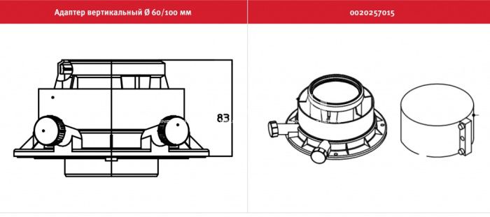 Вертикальный адаптер Protherm является элементом системы удаления продуктов сгорания для конденсационных котлов Рысь К, это часть коаксиальной системы "воздух-продукты сгорания" или "труба в трубе" с внутренней трубой диаметром 60 мм для отвода продуктов сгорания (“дымовая часть”) и внешней трубой Ø100 мм для подвода воздуха(“воздуховод”). Состав комплекта: адаптер 60/100 — 1 шт. крепежный хомут — 1 шт.