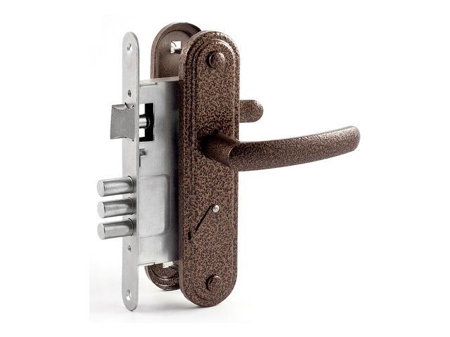 Врезной замок с сувальдным механизмом секрета. Комплектуется подпружиненными ручками. Оснащен 3-мя стальными ригелями диаметром 12 мм. КОМПЛЕКТНОСТЬ Замок Ответная планка Ручки Комплект крепежа