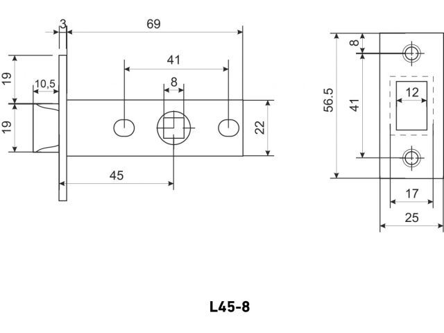 Универсальная защёлка врезная для установки на деревянные межкомнатные двери. Материал - сталь оцинкованная штампованная, гальваническое покрытие. Под ручку с квадратом 8 мм. Удаление ключевого отверстия - 45 мм. Торцевая планка с защитной пленкой для сохранения покрытия. Ширина планки - 25мм. Габариты корпуса - 72.5х22х15 мм. В комплекте - защелка, ответная планка и белый пластиковый вкладыш к ней, саморезы.