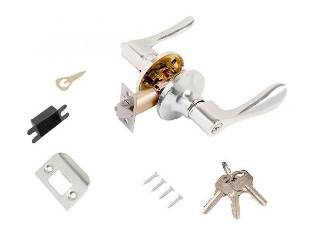 Ручка-защелка фалевая, нажимная для межкомнатных дверей . Материал ручек - алюминиевый сплав, накладок- сталь. Гальваническое покрытие. Предназначена для дверей толщиной до 40 мм. Регулируемое расстояние от края двери до оси ручек 60-70 мм. Скругленная защелка размерами 14х19 мм с вылетом 12 мм. Габариты корпуса врезной защелки 85х23х20 мм.