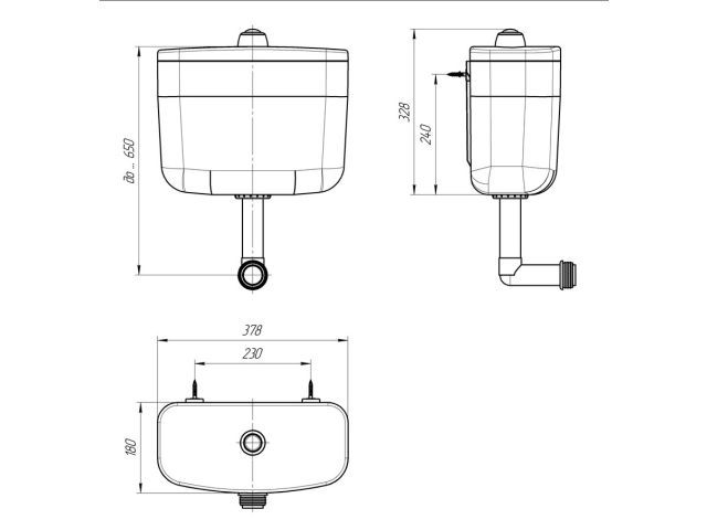 Бачок для унитаза пластиковый тип БС ИНКОЭР (И-Бачок-Тип БС) устанавливается непосредственно чуть выше унитаза, такая конструкция больше всего подходит для санузлов общего назначения. Смывной бачок высокоуровневый в комплекте с трубой подключения, диаметр выходной трубы - 40 мм, длина трубки - до 650 мм. Паз для бокового клапана необходимо прорезать по месту удобному для подключения к сети холодного водоснабжения на правой или левой стенке бачка. Тип: бачок; Длина: 378 мм; Ширина: 180 мм; Высота: 328 мм; Вес нетто: 2,2 кг; Цвет: белый; Установка бачка: Сделать разметку на стене с расстоянием между отверстиями 230 мм. Просверлить отверстия и установить кронштейны с помощью дюбелей. Установить бачок на кронштейны и несколько осадить к низу для плотной посадки на кронштейны. Вставить манжету в корпус клапана. При необходимости укоротить трубу по размеру. Вставить колено соединительное в манжету бачка на 20-25 мм. На свободную сторону колена надеть манжету и вставить в отверстие унитаза.