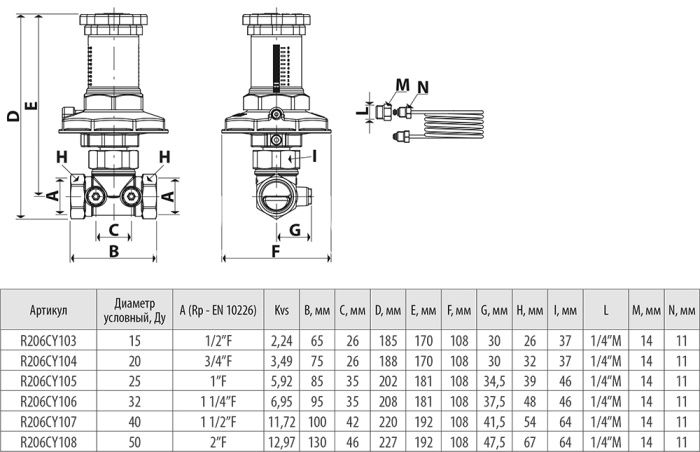 Регулятор перепада давления Giacomini R206C является пропорциональным регулятором прямого действия, работает без дополнительных источников энергии. Необходимое значение перепада давлений регулируется бесступенчато, в двух диапазонах – нижнем от 50 до 300 мбар (5 – 30 кПа) и верхнем от 250 до 600 мбар (25 – 60 кПа). Переключение диапазонов осуществляют в ручном режиме переводом муфты в положение «L» (низкое) или «H» (высокое). Необходимое значение настройки или значение поддерживаемого перепада давления определяют по диаграммам регулирования. На предприятии установлено минимальное значение. Необходимая заданная величина устанавливается с использованием специального инструмента. В комплект поставки входит импульсная трубка (1000 мм), которую необходимо подключить к подающей линии. Корпус регулятора перепада давлений имеет внутреннюю резьбу, предусмотрены два штуцера с внутренней резьбой для подсоединения измерительных ниппелей для осуществления измерений дифференциальным манометром. Технические характеристики: максимальное рабочее давление, бар: 16; минимальная рабочая температура, °C: 5 (чистая вода); максимальный перепад давления на клапане, бар: 2; диапазон рабочих температур, °C: 5 – 110 (-20 – 110 с антифризом).