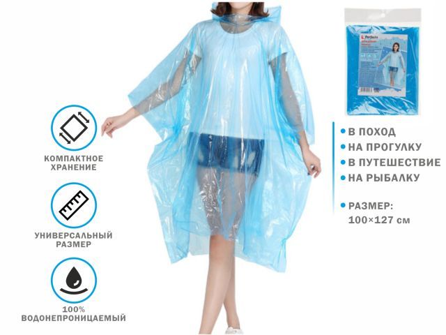 Подойдет для всех возрастов, мужчин и женщин. - Отличное решение для велопрогулок, рыбалки, прогулок с детской коляской. - Изготовлен из водооталкивающего материала - полиэтилена. - Размер: 100х127 см. - Компактный, легко складывается. Удобно взять с собой и надеть в нужный момент. Не является средством индивидуальной защиты.