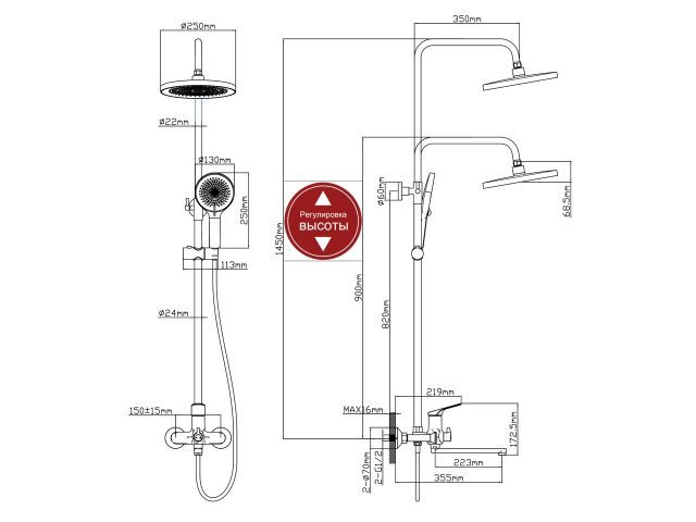 Душевая система D35, серия 710 черный ECONOCE(Длинный L-излив 223 мм, высота 1450 мм, глубина 350 мм)