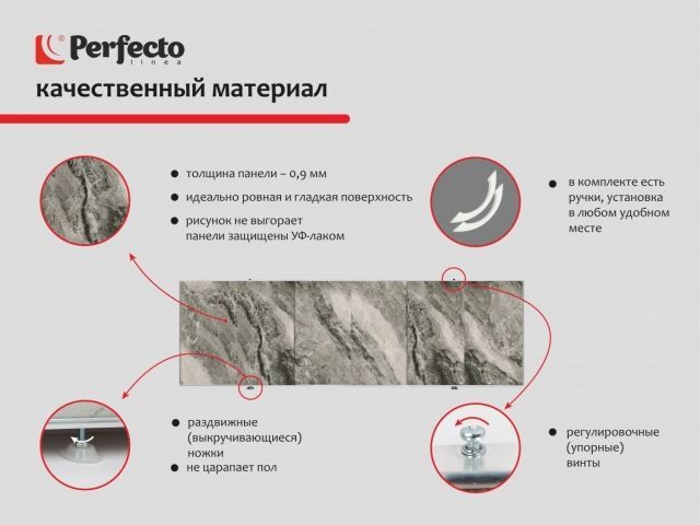 Двухполосные направляющие из алюминиевого сплава -Не подвержен коррозии -Прочная конструкция - опорные трубки впрессованы в направляющие -Установка практически под любую ванну благодаря регулировочным упорам сверху -Простая и удобная установка - ручки для дверок можно установить с любой стороны -Возможность сделать технологические вырезы под коммуникации