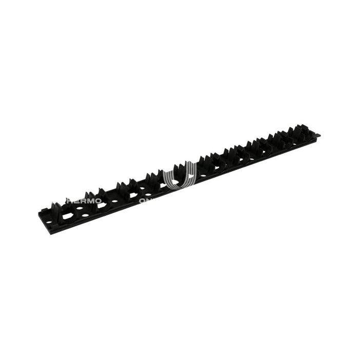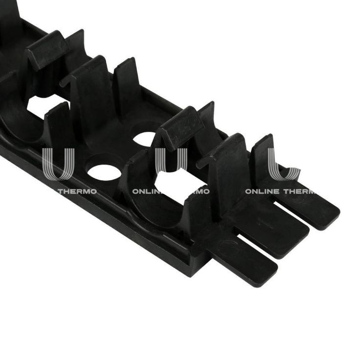 Фиксирующая шина позволяет быстро и надежно фиксировать трубы при монтаже системы водяной теплый пол, предотвращая всплытия и заломы трубы. Шина отформована из полипропилена и представляет собой рейку с клипсами для фиксации полимерной трубы (расстояние между центрами клипс 50 мм, количество клипс на изделии 10 штук). Между клипсами выполнены отверстия для