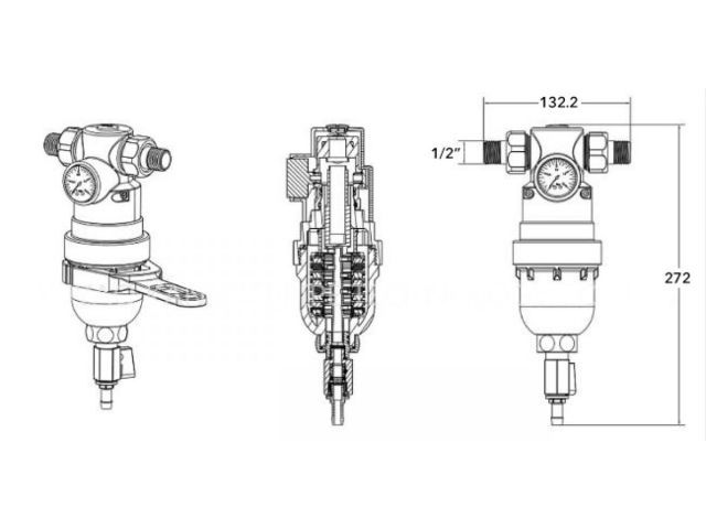Фильтр самоочищающийся 1/2' нар., с манометром, AV Engineering (инд. упак.)(промывной латунный, фильтр разборный, ступенчатый)