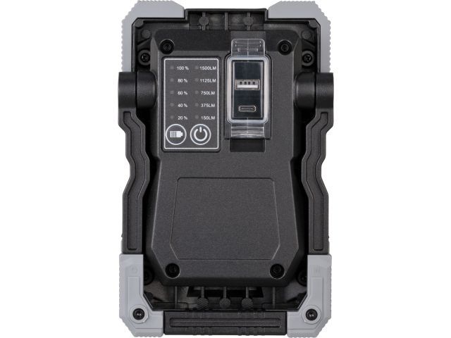 Световой поток макс.: 1500 Лм. Мощность: 15 Вт. 5 режимов яркости: 100-75-50-25-10% Рабочий ресурс: до 25 часов Ударопрочный алюминиевый корпус, углы из прочного высококачественного пластика. Ручка для переноски, а также используется как опора при установке на поверхности под разным углом. Цветовая температура: 6500 К. Класс защиты: IP65 (при закрытой крышке гнезда зарядки). Аккумулятор: встроенный, литий-ионный на 3,7 В5 А.ч Зарядный вход: USB-микропорт на 5 В, 1 А. Время зарядки: примерно 3 ч. Во время зарядки индикатор показывает степень зарядки. Если аккумулятор длительное время не используется, нужно производить зарядку каждые 3 месяца. Тип кабеля USB зарядки - АС