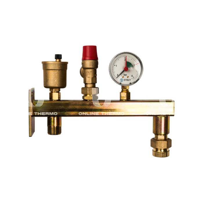 Группа безопасности Stout серии SVS-0006 предназначена для присоединения расширительного бака к системе теплоснабжения, а также для удаления воздуха и защиты системы и оборудования от избыточного давления. Группа безопасности состоит из предохранительного клапана, автоматического воздухоотводчика и манометра, смонтированных на полой стальной консоли квадратного сечения. Консоль снабжена прямоугольным фланцем с отверстиями для закрепления ее на стене. Снизу к консоли приварены два патрубка для присоединения группы безопасности к трубопроводу системы теплоснабжения и подключения расширительного бака. Воздухоотводчик, манометр и быстроразъемное соединение для расширительного бака присоединены к консоли через пружинные отсечные клапаны. Группа безопасности Stout SVS-0006 выполняет следующие функции: подключение расширительного бака к системе теплоснабжения; защита от превышения давления в системе; отвод из системы воздуха; индикация давления в системе на уровне манометра.