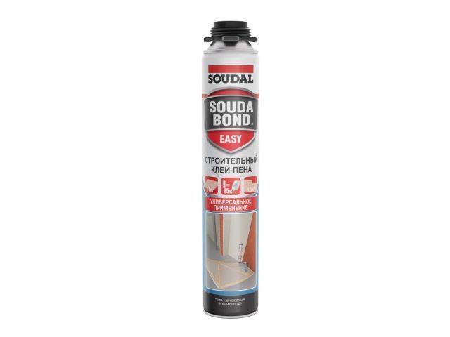Клей-пена монтажная SOUDAL Soudabond Easy 750 мл (121618) - быстросохнущий полиуретановый клей в аэрозоле с высокой производительностью для крепления гипсокартонных плит и панелей из пенопласта внутри и снаружи помещений. Свойства: - Быстросохнущий - полное отверждение около 60 минут (при 20° C/65 % RH); - Высокопроизводительный - 12 м? (при прокладывании полоски диаметром 30 мм); - Тиксотропный - не стекает с вертикальных поверхностей; - Обеспечивает дополнительную термо- и звукоизоляцию; - Отличная адгезия к большинству строительных материалов: кирпичу, бетону, штукатурке, гипсу, дереву, металлу и пластмассам; - В случае необходимости шов можно окрашивать. Применение: - Приклеивание гипсокартонных плит и из волоконного цемента в технологии сухой застройки, декоративных плит, из древоподобных материалов и пластмасс, металлических листов и т. д. ко всем распространенным строительным материалам; - Крепление плит и изолирующих панелей из различного типа полистирола, полиуретана, вспененного фенола (PUR, PIR, XPS, EPS, PF), а также минеральной ваты и пробки к бетону, кирпичу, камню, древесине и металлам (например, при изоляции и утеплении контейнеров, гаражей и т. д.); - Приклеивание блоков из газобетона и пористой керамики в перегородках (конструктивно ненагруженных) и малой архитектуре. Замечания: - Всегда увлажняйте поверхности перед нанесением клея, чтобы ускорить процесс отверждения и улучшить структуру соединения; - Высохший клей должен быть защищен от УФ-излучения; - Не нагружайте, не подвергайте движению область склеивания около 2 ч.
