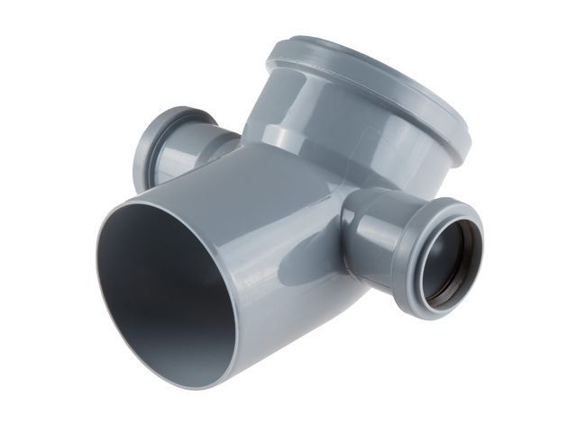 Отвод канализационный диаметром 110 мм под углом 45 градусов для монтажа систем внутренней канализации. Имеет выходы слева и справа для трубы диаметром 50 мм