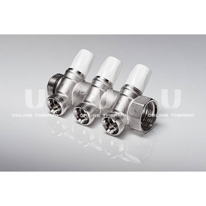 Коллектор распределительный с запорными клапанами Rehau Rautitan 11316451001, G1" ВР-НР, на 3 контура 3/4" НР, модульный, конусное соединение
