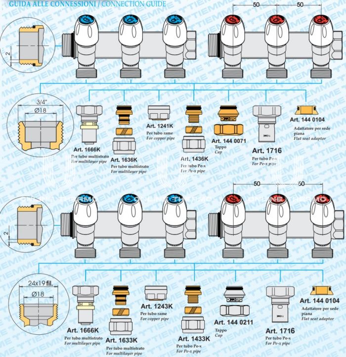 Распределительные коллекторы с вентилями Tiemme серии Maxima имеют межосевое расстояние отводов 36 и 50 мм и предназначены для подвода, регулирования и распределения рабочей среды от основного трубопровода в системах отопления и водоснабжения. Корпус коллектора изготавливается из хромированной латуни. К коллекторам подходят конусные соединители (евроконус) 1/2 и 3/4. Коллекторы производятся на 2, 3, 4 и 5 выходов с основной магистралью размерами 3/4 и 1 дюйм. Их можно монтировать с металлопластиковыми, полипропиленовыми, PEX трубами, стальными и медными трубами через специальные переходники.