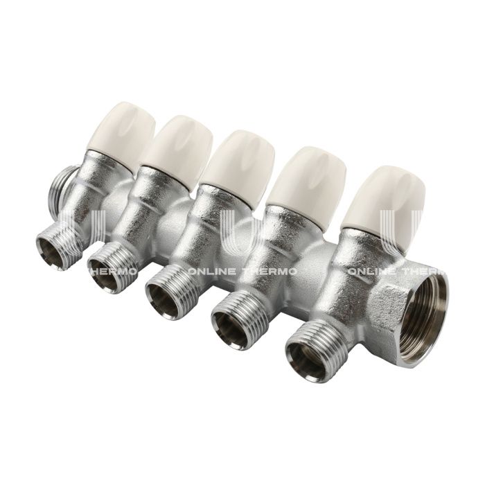 Коллектор распределительный с запорными клапанами Tiemme Maxima 1860028 ВР-НР 1", на 5 контуров НР 1/2", модульный, хромированный