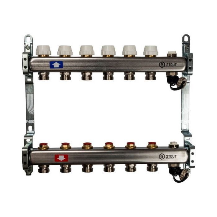 Коллектор Stout из нержавеющей стали без расходомеров, с воздухоотв. и сливом 6 вых.